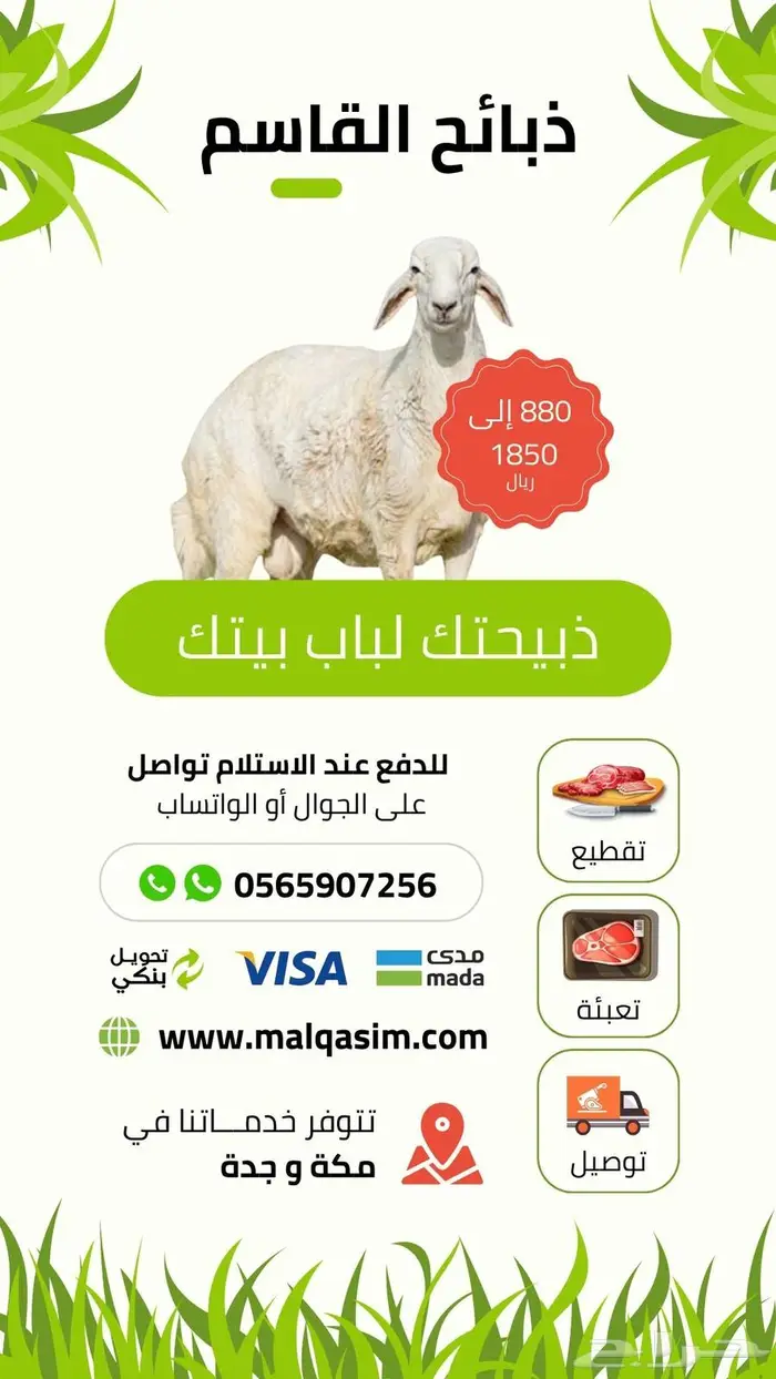 يوجد نص ذبيحة بنصف السعر بالتنسيق معنا , للطلب او للإنضمام لتلقي عروض النصف ذبائح عبر رسائل الواتساب يرجى التواصل على رقم الواتساب ( رقم الجوال يظهر في الخانة المخصصة )