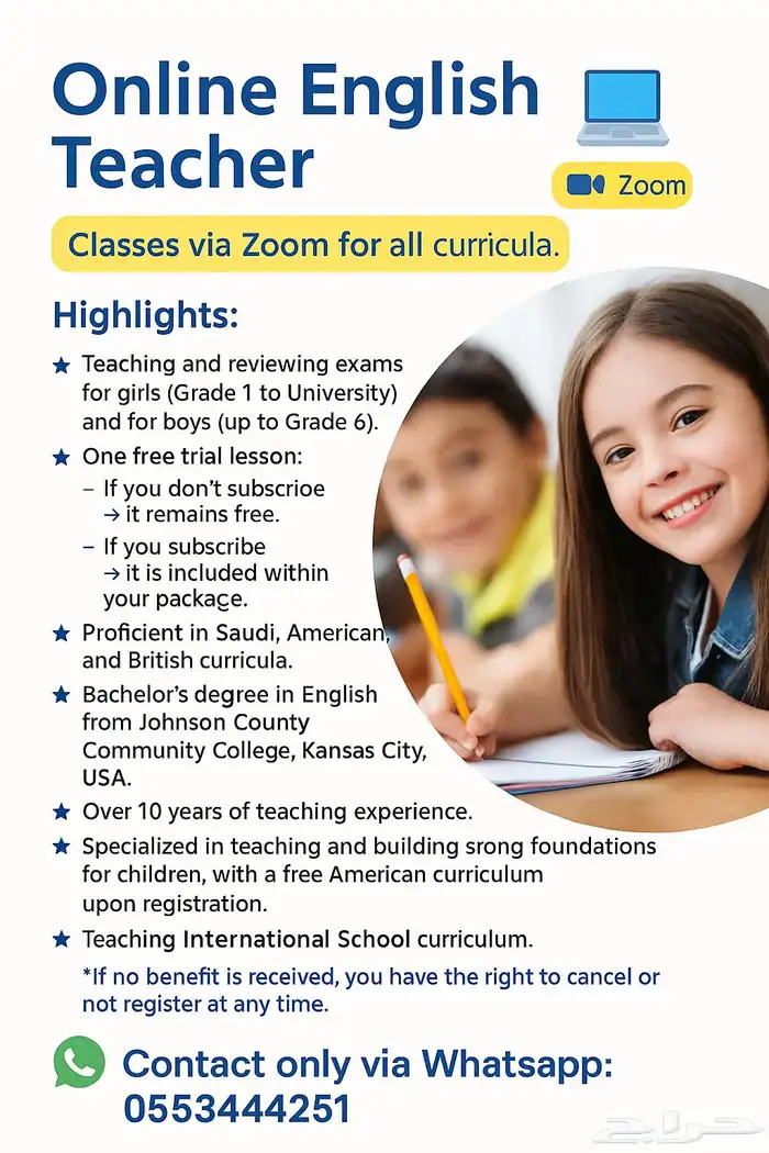 -خبره في تدريس الاطفال والتأسيس مع وجود منهج امريكي مجاني عند التسجيل.
