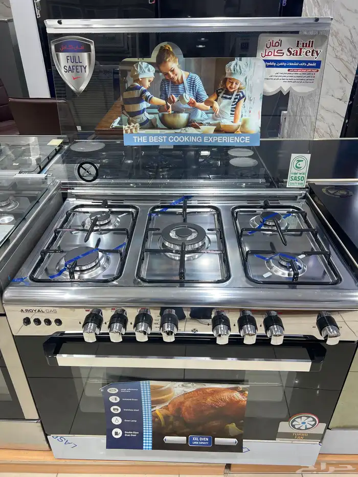 غاز رويال 5 عيون امان كامل مروحة تربو خروج النار من ثلاث شعلات شبك متصل عيون ايطاليه توصيل مجاناً