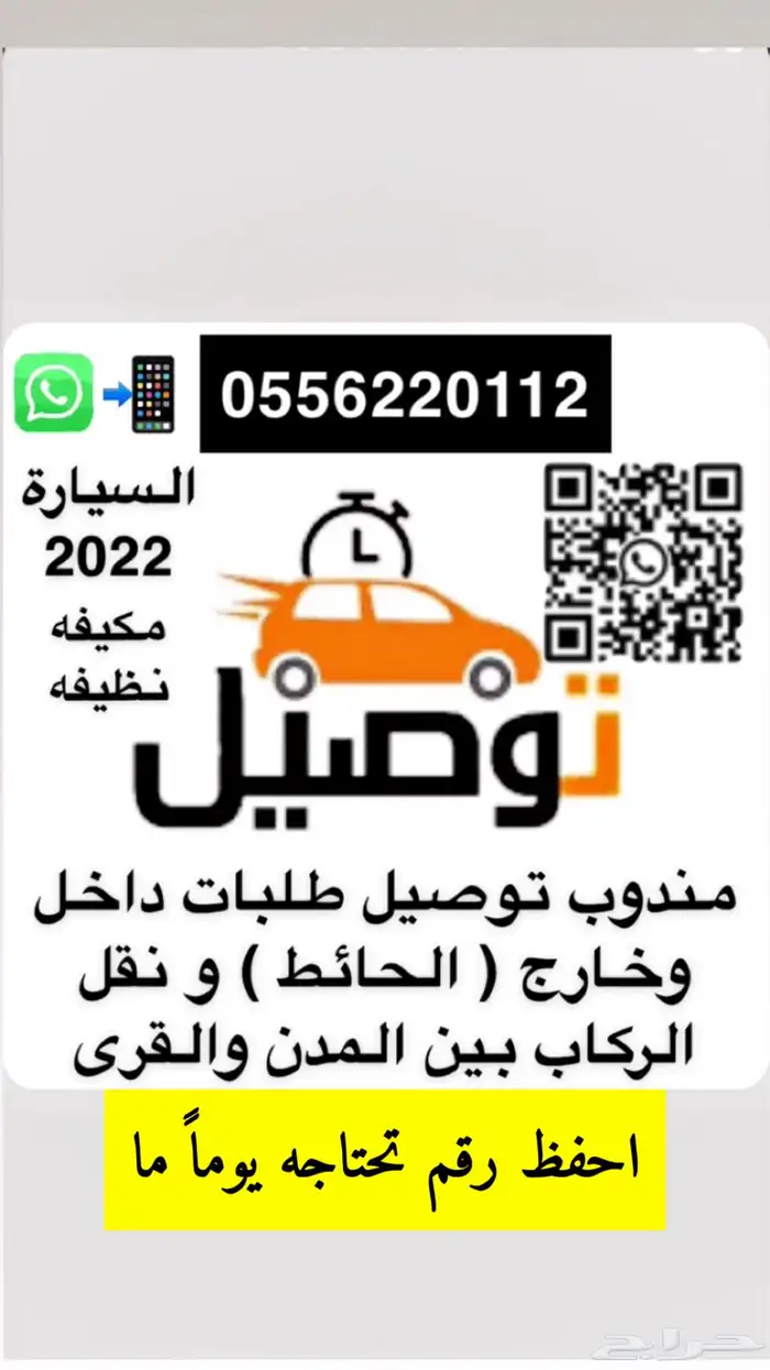 توصيل مشاوير داخل وخارج الحائط الرجاء قراءة الاعلان جيدا قبل الاتصال ‏‎موقع التحرك من ( الحائط ) ‏‎تنبيه... ( مشاويري شخصيه او عائليه ‏‎ ‏‎ليس لي وجهه معينه والوجهه يحددها المتصل بنفسه ) ‏‎توصيل مشاوير داخل و خارج الحائط ‏‎توصيل بسياره حديثه موديل 2022 ومكيفه ونظيفه ‏‎الالتزام بالموعد ‏‎خدمه 24 ساعه ‏‎توصيل من الباب الى الباب ‏‎احجز موعدك من الان وحدد وجهتك ‏‎احفظ رقمي عندك واتصل بي وقت الحاجه ‏‎الرجاء التواصل واتساب او اتصال فقط لااحد يتواصل عن طريق الموقع لقلة دخولي ‏‎نسعد لخدمتكم وشكرا لمروركم الرائع