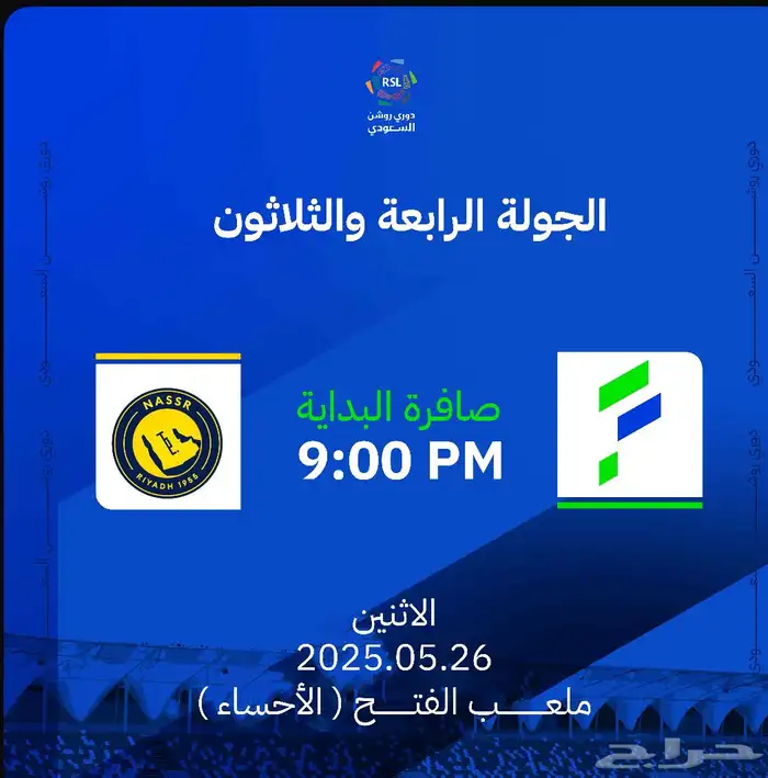 تذاكر مبرات النصر ضد الفتح الجولة 34 (3) تذاكر النصر (2) تذاكر الفتح التواصل ( رقم الجوال يظهر عند الضغط على زر تواصل )