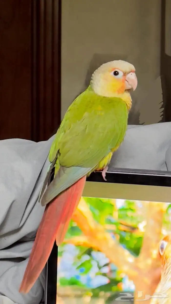 ببغاء أليف ويحب اللعب النوع كنيور العمر تقريبا 8 أشهر اللون اناناس معه جواز صحي ومعه قفص وأكله