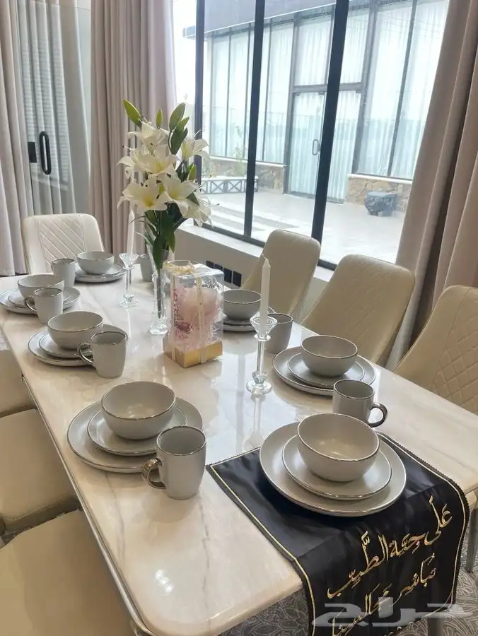-مقلط تحضير + طاوله طعام 8 كراسي مزودة بطقم صحون زجاج