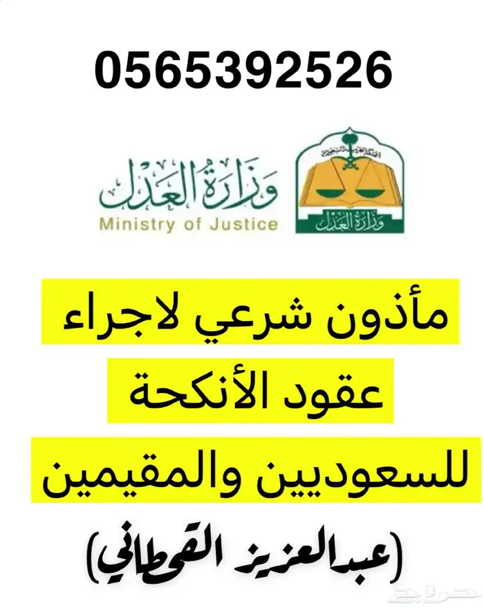 ماذون شرعي لعقود ألانكحة مملك للمواطنين والمقيمين نسعد بخدمتكم ونقوم بانشاء طلب عقد الزواج وكذلك لجميع الاستفسارات الخاصة بالعقود ودقيق في الموعد والانجاز ابها -خميس مشيط -احد رفيده. الواديين- المسقي - تمنيه. المسقي سراة عبيده الحرجه. ظهران الجنوب