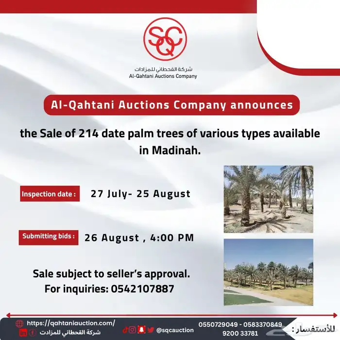 تعلن شركة القحطاني للمزادات عن بيع مجموعة 214 نخلة تمر من أنواع مختلفة في المدينة المنورة