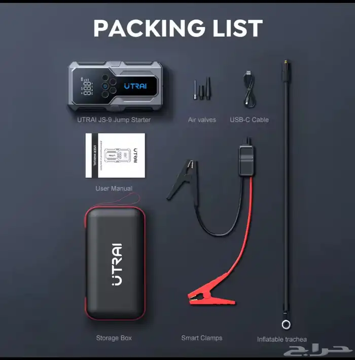 جهاز "UTRAI JS-9" وهو جهاز تشغيل سيارة (Jump Starter) مدمج به ضاغط هواء [1، 3].