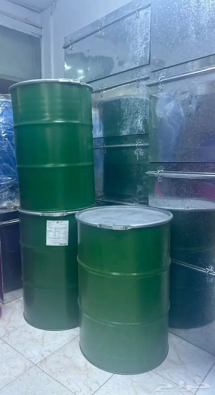 برميل حديد اخضر الماني بسعة 200 لتر مفتوح من الأعلى مع غطاء وحزام محكم للإغلاق
