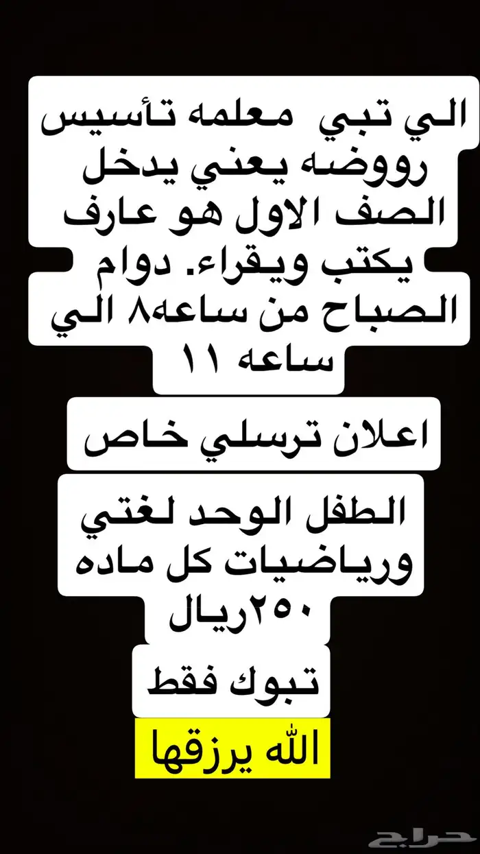 معلمه تاسيس رووضه يعني يدخل الطفل صف اول الا هو يعرف الاحروف والقراءه وكتابه الماده 250 ريال لغتي ورياضيات.
