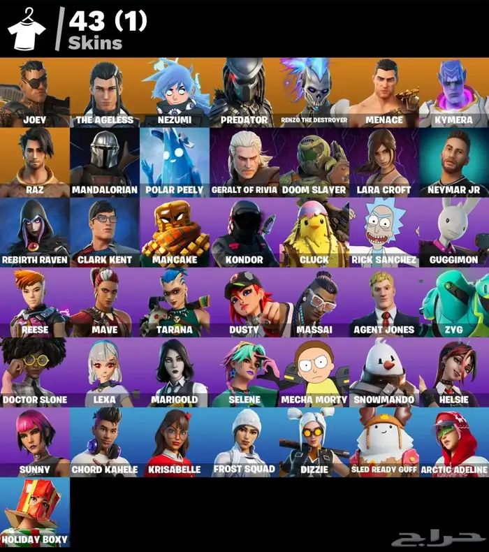 السلام عليكم .. حساب فورت نايت للبيع الحساب يربط |سوني | PC | اكس بوكس| الحساب فخم جدًا فيه سكنات أيتم شوب عرق حلوة مثل نيمار و لارا كرافت ومايداس البنت والأكسات كذلك منها اكس النجمة و الشفل .. 43 سكن | 🎖️ 53 اكس | 🎖️ 49 رقصة | 🎖️ 48 مظلة | 🎖️ 61 شنطة | 🎖️ 666 مستوى الحساب | 🎖️ السعر : 55 ﷼