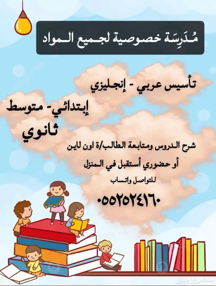 مدرسة خصوصية تأسيس عربي- إنجليزي ابتدائي-متوسط-ثانوي متابعه وشرح الدروس للطالب/ ة اون لاين / حضوريًا استقبل في المنزل (خبره 7 سنين) للتواصل واتس أب: ( رقم الجوال يظهر عند الضغط على زر تواصل )