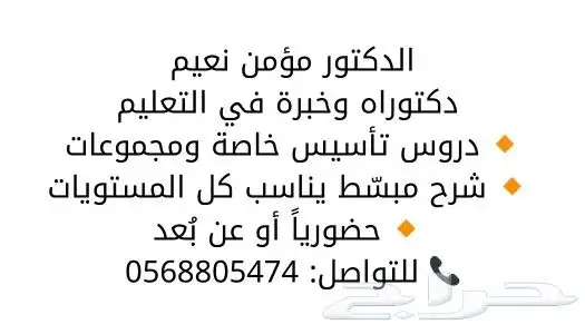 مدرس متخصص في تأسيس المراحل الأولية (قراءة ; كتابة ; حساب ; مهارات أساسية) 📚 خبرة واسعة في تعليم الأطفال بأساليب ممتعة ومبسطة 🌟 متابعة فردية وتأسيس قوي من البداية 👦👧 برامج تناسب كل مستوى من مستويات الطلاب 📞 للتواصل والحجز: وتس او اتصال