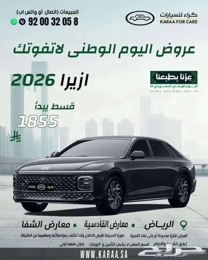 GLS 2026 قير اوتماتيك بنزين Azira Classic 2026 الموديل/ 2026 الوكيل / سعودي الالوان /متوفر جميع الالوان الفئات / متوفر جميع الفئات من شركه كراء السعوديه للسيارات **************************************** المواصفات 3500 cc اوتوماتيك 8 سرعات الدفع _ دفع امامي سقف بانوراما جنوط مقاس 18 انش انوار ليد عالي واطي ليد نهاري متصل اشارات بالمرايا زيق اسود جانبي حساسات اماميه حساسات خلفيه كشافات ضباب خلفية دخول ذكي تشغيل ذكي تشغيل عن بعد مقاعد جلد مقعد السائق والراكب كهربائي زجاج كهربائي اوتو لمسه واحده مرايا كهرب بخاصية الطي الاوتوماتيكي مرايا داخليه تعتيم مقود مكسو ب الجلد تحكم ب المقود للنظام الصوتي طبلون شاشة قير F1 خلف المقود عداد رحلات ب اللغه العربية مثبت سرعه بلوتوث شاشة معلومات كاميرا خلفيه نظام ابل كار بلاي مكيف لمس ب تحكم منفصل نظام السنتر لوك للسائق والراكب منفذ طاقه منفذين تايب سي اماميه شاحن لاسلكي بريك كهربائي مع خاصية الاوتو هولد تكايه بالوسط درج فتحات تكييف خلفيه منفذين تايب سي خلفية فرامل abs حساس كفرات نظام الثبات الالكتروني عدد 2 اباج امامية 2 على المراتب عدد 5 احزمة امان ************************************** ■مبيعات الكاش و الأقساط / تواصل معنا عبر الرقم الموحد 920032058 للواتس اب التواصل مباشرة على الرقم 920032058 ********************** قم بزيارة موقعنا للمزيد من السيارات المميزة www.karaa.sa ■مبيعات الكاش و الأقساط / تواصل معنا عبر الرقم الموحد 920032058 قم بزيارة موقعنا للمزيد من السيارات المميزة www.karaa.sa ************************ للواتس اب التواصل مباشرة على الرقم 920032058 او بنسخ الرابط المباشر 920032058 *********** ● مبيعات التقسيط / ◄الــســيـــارة الـــمـــطــلـوبة : ◄الــراتــب علــي اي بــنــك : ◄اجــــــمـــــالـــي الــــــراتــــب : ◄الالـــــــتـــــــــزامــــــــــــــــــات : ◄جـــــــهـــــــة الــــــعــــمــــــل : ◄مــــــديــــــنـــــة الــــعـــمــل : ◄هــل تـــوجـــــد مخـالفـات : ◄هل توجد تعثرات بسمه : ◄العـــــــمــــــــــــــــــــــــــــــــــر : ● معتمدون لدى جميع البنوك وشركات التمويل ● خدمة الشحن لجميع مناطق المملكة أوقات العمل من :- 9.00صباحا الي 9.00 مساء عروض خاصة على التظليل والحماية والعازل الحراري تصل الى 50%مع هدايا مجانية