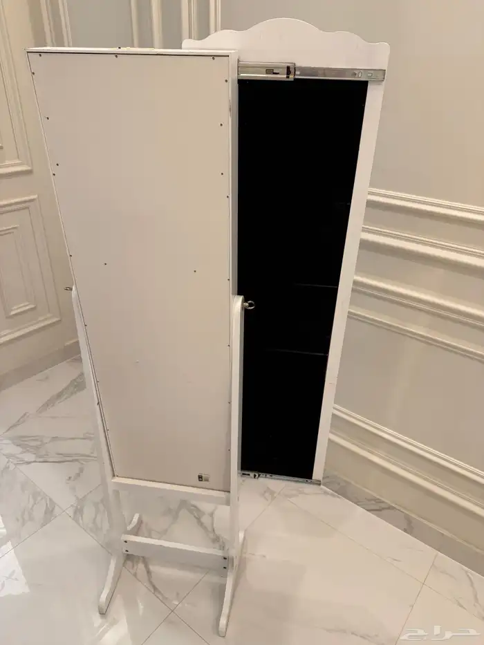 - مرآة طويلة بيضاء بتصميم كلاسيكي أنيق. - مزوّدة بدرج داخلي لتنظيم وحفظ الإكسسوارات. - واقفة على قاعدة ثابتة (Free standing). - بحالة جيدة ومناسبة للاستخدام.