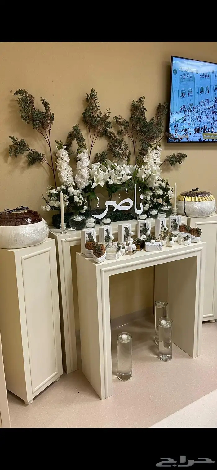 المدخل 2 طاولات مستطيله 2 استاند مربع ملاحظه .. المدخل بس الخشب بدون الديكورات و الورد