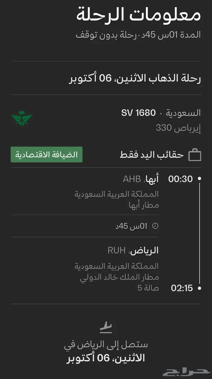 عندي تذكرتين بالبوردنق جاهزة للبيع من أبها للرياض الدرجة الاقتصادية على الخطوط السعودية الاقلاع الساعة 12:30 صباحاً بعد منتصف الليل يوم 6 / 10 الليلة بعد منتصف الليل الحضور 11:45 مساءً سعرها بالموقع 416 ريال للمقعدين والبيع سمح