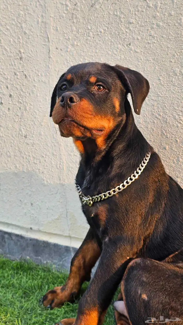 الكلب عايش داخل البيت ومودب مع الاطفال ولا عنده عض ابدا .. عنده اوامر . high five. sit .down .up. stay .jump
