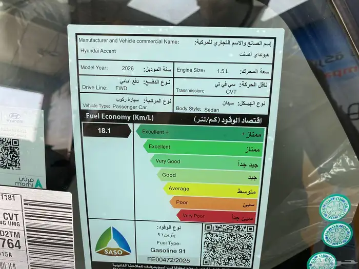 هيونداي اكسنت 2026 قير اوتماتيك بنزين شاشة كاميرا مخمل جنوط 15 إنش 5 مقاعد 5 أحزمة أمان قير اتوماتيك 1.5 سي سي زجاج كهرباء اشارات مرايا كهرباء تحكم دركسيون مثبت سرعة منافذ طاقة
