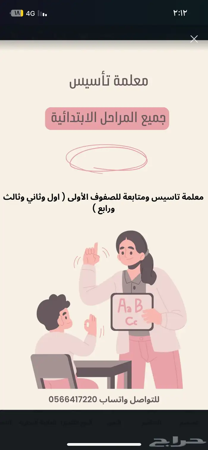 معلمة خصوصي تأسيس ومتابعة لجميع المراحل الابتدائي ( اول وثاني وثالث) للتواصل ( رقم الجوال يظهر عند الضغط على زر تواصل )