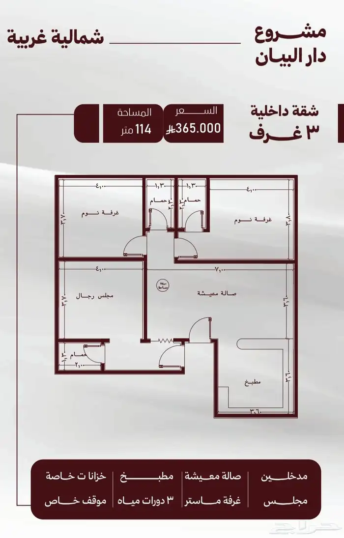 3غرف خلفيه شماليه غربيه بمساحه 114م