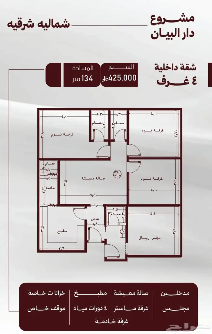 4غرف خلفيه شماليه شرقيه بمساحه 134م