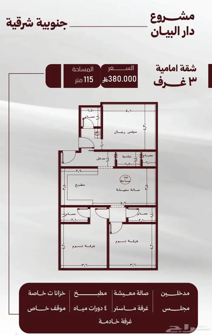 3غرف اماميه جنوبيه شرقيه بمساحه 115م