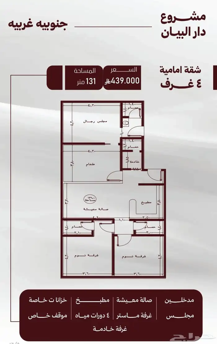 4غرف اماميه جنوبيه غربيه بمساحه 131م