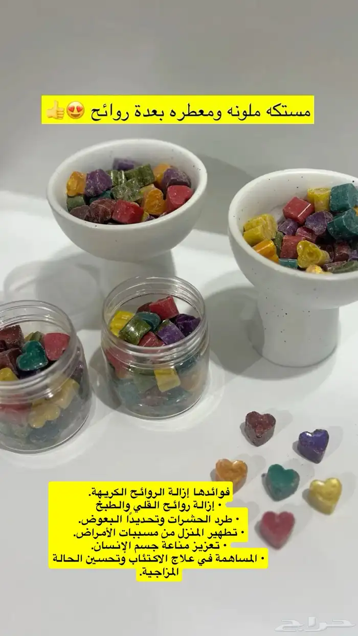 مستكة ملونة بعدة روائح فوائدها إزالة الروائح الكريهة. • إزالة روائح القلي والطبخ • طرد الحشرات وتحديدًا البعوض. • تطهير المنزل من مسببات الأمراض. • تعزيز مناعة جسم الإنسان. • المساهمة في علاج الاكتئاب وتحسين الحالة المزاجية.