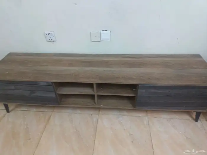 Modern design in a dark brown wood color that adds luxury to the place, suitable for large screens. It has drawers on the sides for storage, and open shelves in the middle for the receiver, PlayStation, or decorations.